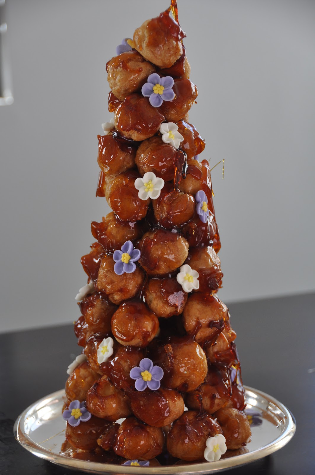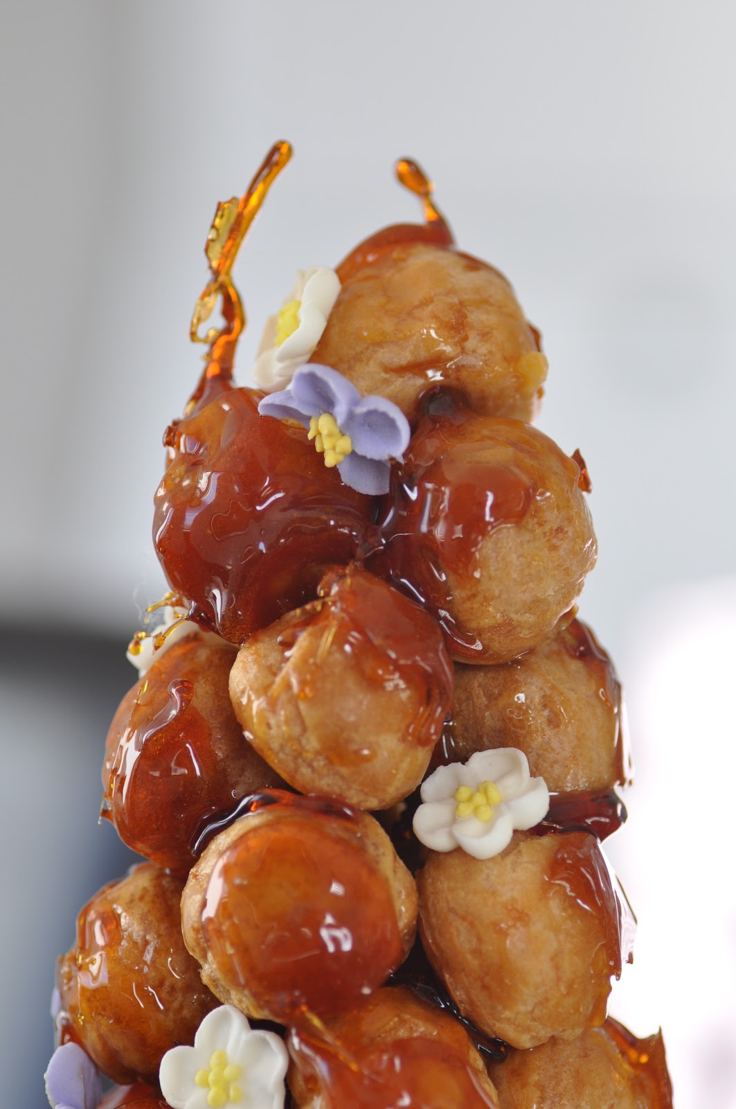 I was too frightened to make the “nest” that surrounds the croquembouche, fearful that the slightest weight may disturb the integrity of the structure. So instead, I gently decorated with sugar flowers which I think looks just as pretty.