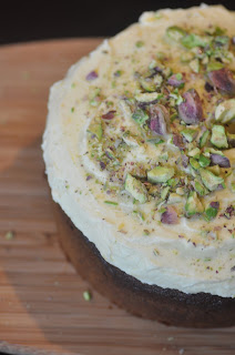 - For the icing, whip the butter with the paddle attachment in a mixer. Introduce icing sugar, one cup at a time, beating continuously on a low speed.Add lemon zest and juice, beating in until smooth. Gradually pour in cream until you achieve a consistency that is easy to spread.Ice the cake and sprinkle with chopped pistachios. Slice with a hot, clean knife and serve.